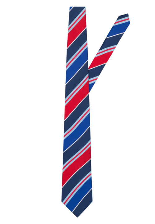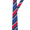 Corbata de seda color azul, aqua, rojo y blanco a rayas.