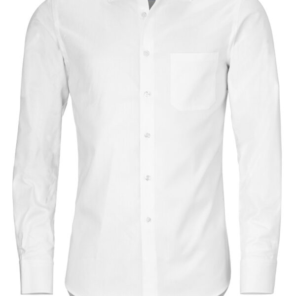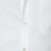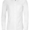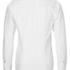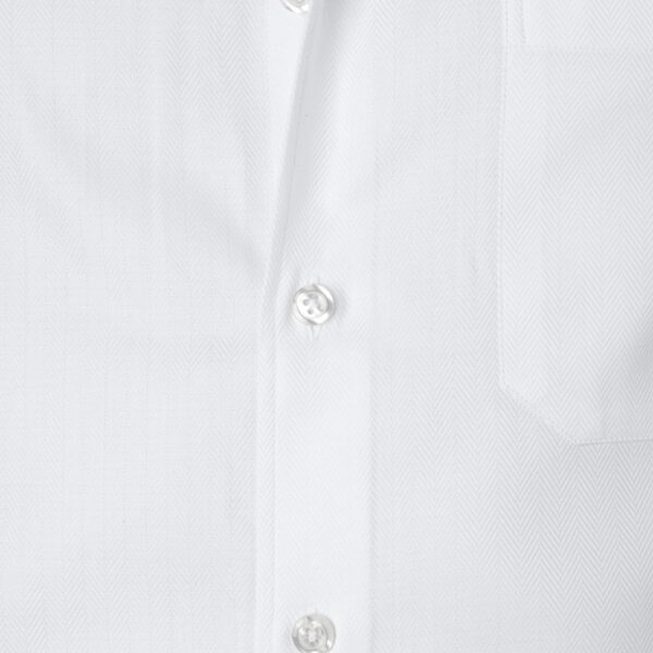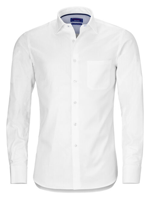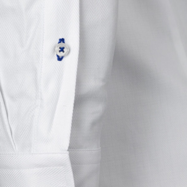 Camisa blanca, de algodón premium, Herringbone, con banda de terciopelo azul en el interior del cuello y con cuadros azules en el interior de los puños.