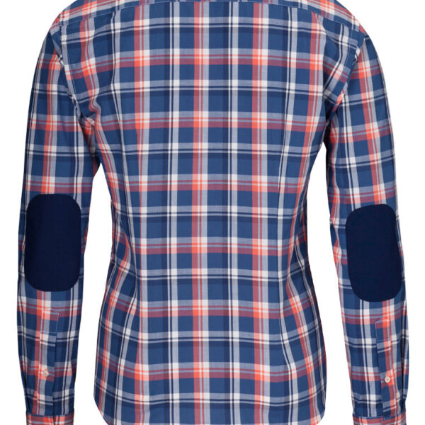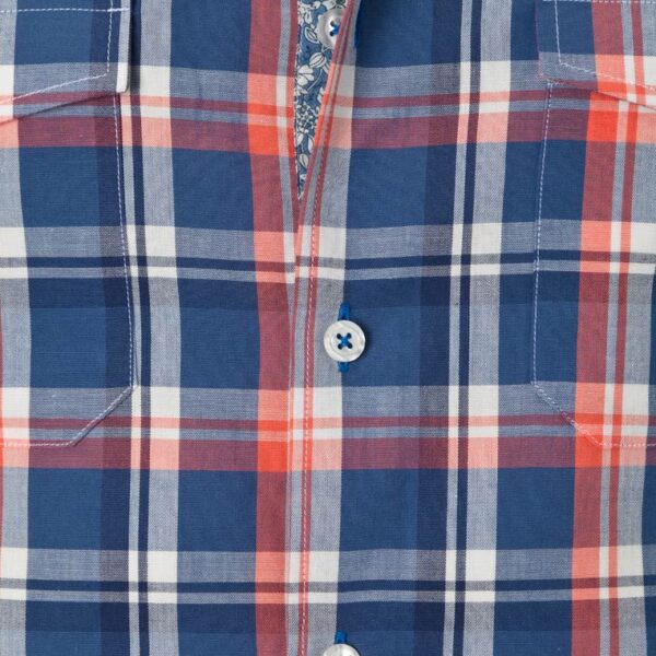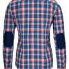 Camisa casual rosa y azul, de algodón premium, a cuadros con parches azul marino en los codos y detalles florales en el interior de la tira de abotonado y de los puños.