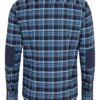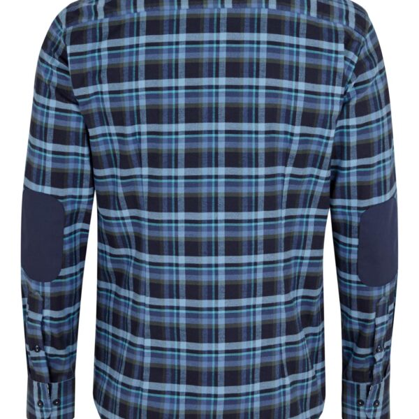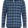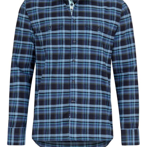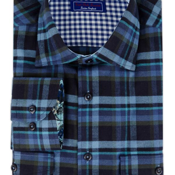 Camisa casual azul, turquesa y azul rey, tartán de franela premium con detalles florales en el interior de la tira de abotonado y de los puños.
